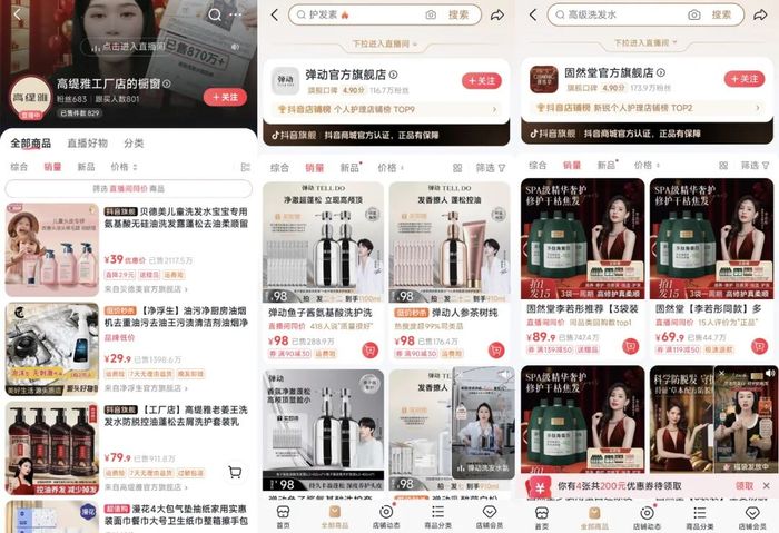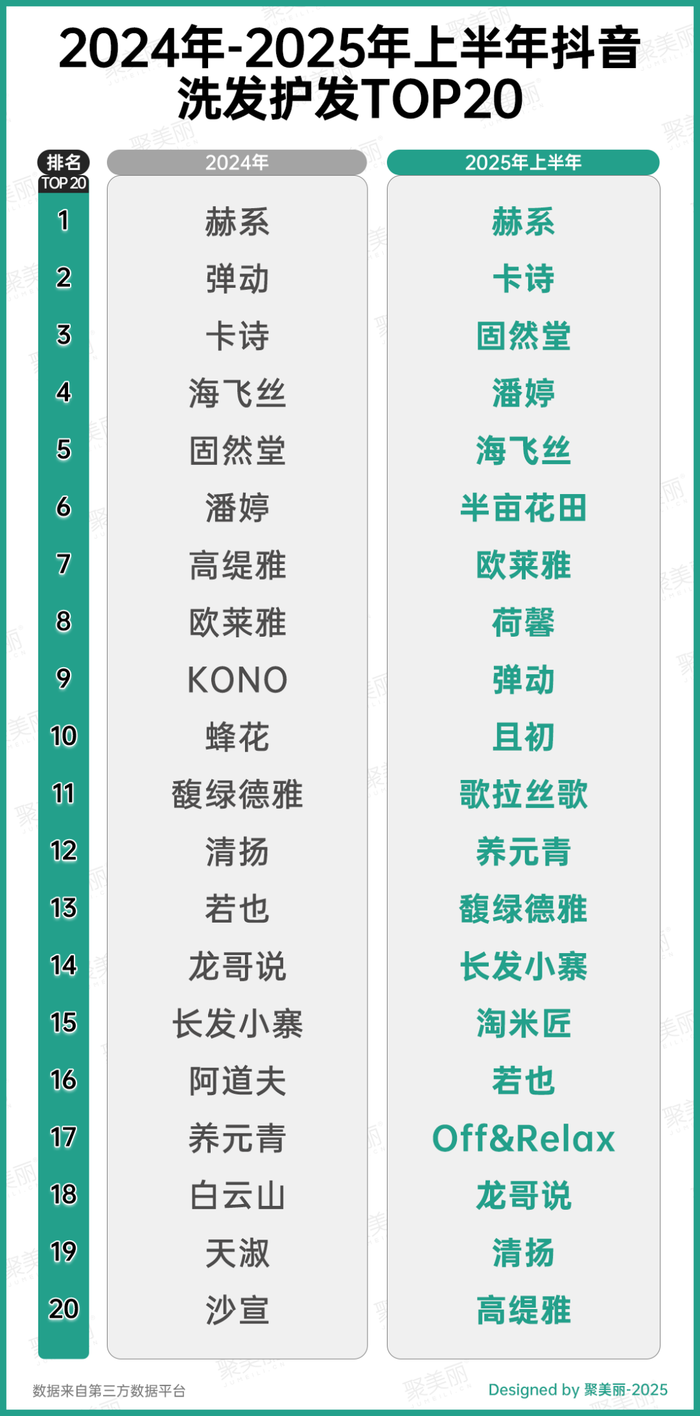 竞争格局开始“转动”,新兴品牌来到风险期? 但必须看到的是,尽管部分业内人士对洗护行业的发展现状,并未像市场数据所呈现的那般乐观。但近年洗护市场竞争格局的变动,也是不容忽视的—— 一直以来,宝洁、联合利华等巨头在洗护市场占据着主导地位,但近年来新兴品牌涌现、白牌做大规模,其绝对优势已被打破,市场份额逐步出现收缩,被新兴品牌、白牌争夺分食。 1)规模化的洗护白牌大军 近两年,白牌在洗护市场的发展势头是较为凶猛的。以2024年至2025年上半年的抖音洗发护发榜单来看,以固然堂、8+minutes弹动、高缇雅为代表的白牌,位居抖音洗发护发TOP前列。