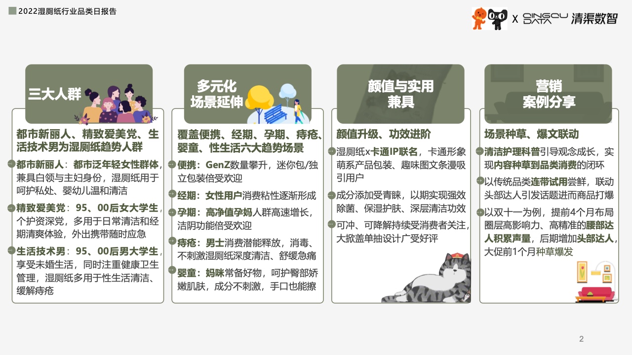 随着国民健康意识的提高,人们愈发重视对私处的护理。湿厕纸因其清洁到位、柔软亲肤等特性越来越受消费者欢迎。对于很多人而言,使用湿厕纸之后犹如打开新世界大门。 “湿厕纸真是擦pp神器!用了这个都不喜欢用卫生纸了,感觉这个擦的干净。” “真的很好用,比平常用的卫生纸擦得要干净很多,防止细菌滋生,纸质厚实不易破,真是居家好物。” 消费者购买情绪的高涨推动了线上湿厕纸市场的加速增长,淘宝天猫平台的湿厕纸市场规模正逐步扩大,2021年为2019年的4倍。 近日,淘宝天猫联合清渠数智发布了《2022湿厕纸行业趋势白皮书》,解析湿厕纸的消费核心人群以及他们背后的消费动机。深度洞察湿厕纸的消费趋势走向,探究颜值升级、场景多元、功效进阶三种趋势下,湿厕纸行业会呈现出哪些品类机会点。 厕纸消费需求升级 众多品牌切入湿厕纸赛道 过去,人们对如厕清洁的要求不高,只要干净即可。湿厕纸的出现,填充了大家的体验空缺,纸品的柔软度、温和度、冲洗性都纳为他们下单时考量的因素。 随着湿厕纸品类的不断精进,消费者的用纸天平正在发生倾斜,2021年约70%的湿厕纸新客来自于纸品市场消费者,湿厕纸正逐步蚕食规模庞大的厕后用纸市场。 湿厕纸赛道吸引了众多品牌入局,近三年来,淘内湿厕纸品牌数量增长3倍,达400余家。德佑、怡恩贝、米特医生等新锐品牌在不断入局,从2021年湿厕纸知名品牌vs新锐品牌销售规模和增速上看,新锐品牌增速较高,可见这些新进玩家仍然有机会抢占高速增长的市场。 女性为湿厕纸购买主力军 Z世代的消费潜力不容小觑 湿厕纸赛道的精细化探索离不开“她经济”助力。女性使用湿厕纸的场景对比男性更加广泛,除了日常清洁,还能通过婴童、孕期、经期、性生活、便携等场景击中女性用户痛点。 25-34岁的一二线城市女性的湿厕纸消费心智较为成熟,购买力较强,年人均消费金额与消费频次均高于整体水平。她们或是白领,亦或者是家庭主妇的角色,平时主要关注身体护理、婴童用品和咖啡产品领域,注重高品质消费。 作为都市新丽人,她们购买湿厕纸时不仅要考虑自身的经期、孕期护理,还要考虑到孩子的私处保护。此外,经济实惠的湿厕纸商品容易得到她们的青睐。 GenZ女生是湿厕纸的高潜力人群,年人均消费金额增幅远高于整体水平,且更愿意为颜值经济买单,主要关注深度保养、精致个护、高阶美妆等领域。 作为个护产品的资深消费者,她们追求更舒适、更精致的使用体验,湿厕纸多用于性生活私处清洁、经期护理等场景。 精致爱美党们的消费档次较高,偏好0.15-0.25元/片以上中高及高价格段产品,还倾向于购买不同规格的包装来适用不同场合。 GenZ男生作为湿厕纸行业的机会人群,具有较高的健康意识、卫生素养,对计生产品有较强的购买偏好,游戏相关需求旺盛。 他们主要看中湿厕纸的杀菌功效,多用于个人卫生与急症缓解,如性生活清洁、缓解痔疮。 相对而言实惠大包装的商品更深得这些生活技术男的心,0.15-0.2元/片中等价格段是他们偏好购买的价格区间。 三大湿厕纸品类消费趋势 颜值升级、场景多元、功效进阶 趋势一:高颜值包装湿厕纸受热捧,萌系IP形象深入人心 高颜值包装可以使产品脱颖而出,达到快速吸睛的目的,对于消费主体为女性的湿厕纸市场而言尤为明显。IP形象得益于其背后的故事性和话题度,有着强“社交货币”属性,产生情感链接,更易俘获消费者的心,配合相关品牌IP营销可以进一步增加人们的消费欲望。 2019年至2021年,高颜值特殊包装的商品消费激增700+%,IP商品独占鳌头。2021年IP款核心消费来自白领女性,女性消费规模较整体高6个百分点。18-24岁的消费者“IP款”人均消费趋势呈高增长态势。 IP形象的选择上,萌系风格更受消费者欢迎,2021年卡通联名IP湿厕纸热销品牌TOP3,分别是维达 x 吾皇万睡、心相印 x 小刘鸭、舒洁 x 羊驼。 趋势二:湿厕纸场景从单一厕后清洁扩展至多元化清洁 随着消费者需求的不断细分,湿厕纸的使用场景也不再单一,目前已拓展出便携、经期、孕期、痔疮、婴童、性生活六大消费场景。其中,经期、便携为高搜索场景,孕期、痔疮为高潜力场景。 湿厕纸具备可冲、除菌、清爽等优势,可适用于各类外出场合,不管是出门逛街,还是长途旅行,便携包装都可以紧扣消费者痛点。 消费者数量增长带动便携场景提升,18-24岁消费新势力人群近三年增长1x倍,7片装、10片装广受欢迎,10片及以下小规格近三年销售额增长2xx%。 女性处于生理期时,不但要保持心情愉悦,还要注重个人卫生。面对经血结块、异味瘙痒等问题,湿厕纸可以更好地解决这些难言之隐,带来清爽洁净的使用体验。 消费者在经期场景中,品类粘性不断增强,年人均消费频次提升20%。从年龄分布上来看,25-34岁人群占比过半,GenZ人群逐年翻倍。 怀孕之后对身体的护理可不能含糊,孕期妈妈的用纸需求比较旺盛,从孕初期到产后期,她们都面临着私处清理难题。 越来越多的孕妈群体开始选用湿厕纸应对特殊时期的困扰,2021年孕期场景消费金额增长4x倍,中高购买力孕妈占孕期人群一半以上。相较其他功能,带有“洁阴“功能的湿厕纸货品更受孕妈欢迎。 湿厕纸触感清凉柔软,有助于缓解痔疮带来的灼热感。消毒功能、不刺激材质是有“痔”之士挑选湿厕纸时的关键考量点。相较于女性,男性